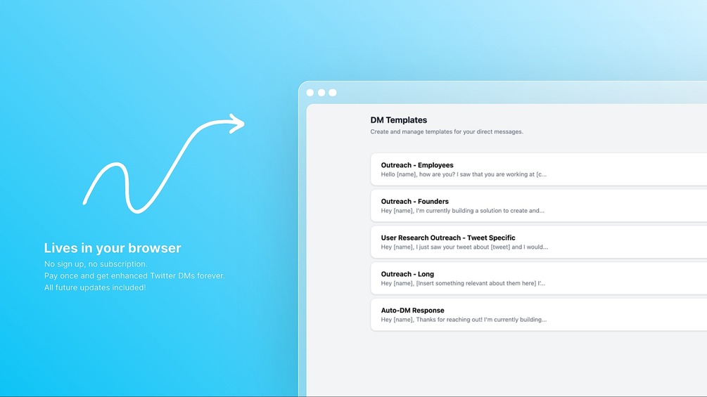 Earlier this year, I had to scale up cold DMs on Twitter, but the endless copy, paste, and edit cycle was just way too slow, so I built a small tool that lets me use templates for writing DMs (See the gif below) and posted it on Twitter. I got quite a lot of DMs since then, asking for the tool, so I decided to finish the extension and release it here on Gumroad! :)