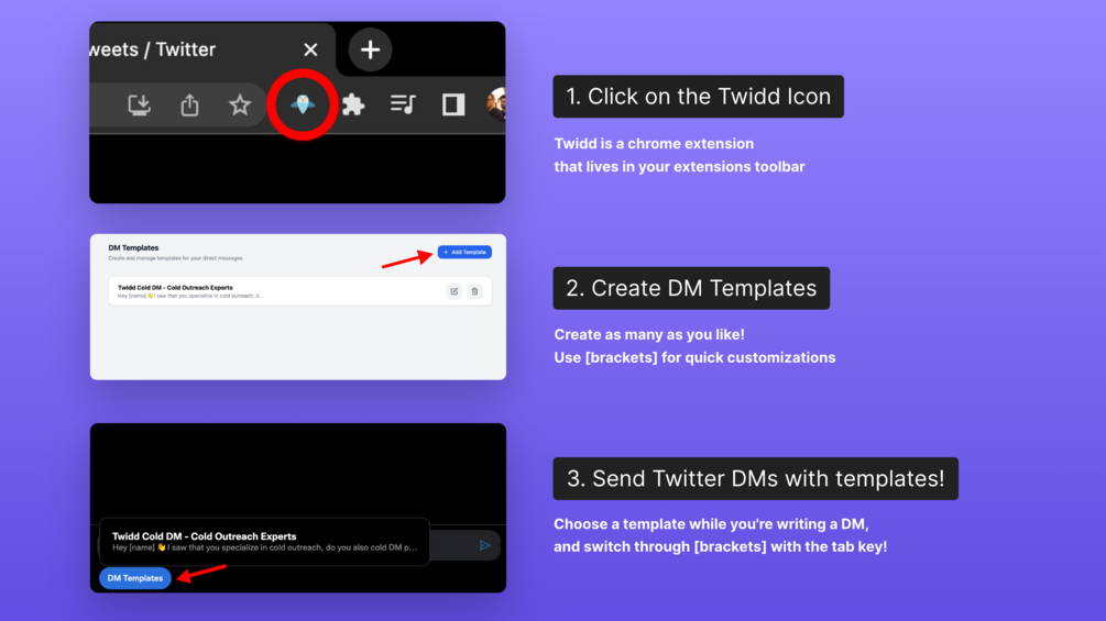 That's what Twidd is for - use templates and become more efficient in your Twitter DMs. Use [brackets] to quickly customize text when using templates in your DMs and toggle through them just by using the tab button ๐ฅ